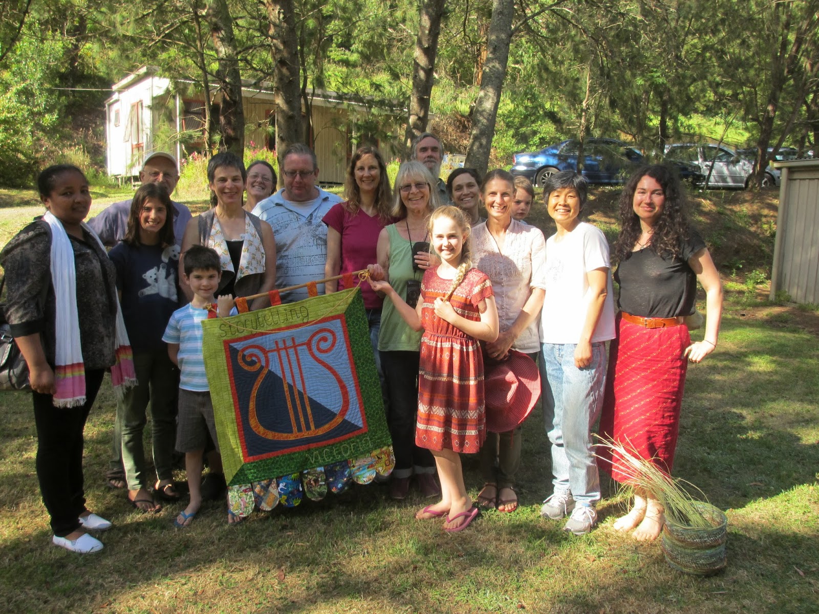 Storyteller Susan Pepper designed and stitched this banner for us. Quilted so it won't crumple and small enough to carry in planes as hand luggage, its admired wherever it goes. Here it is at the Turramurra Folk Music Camp where storytelling workshops were part of the 2014 program.